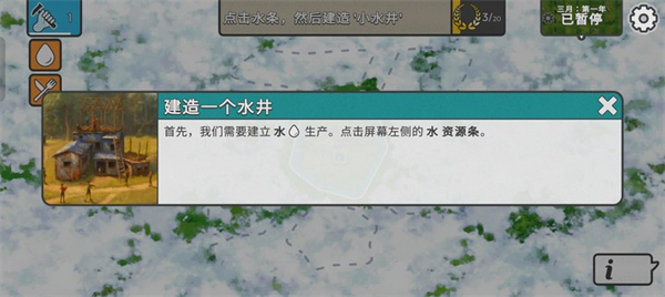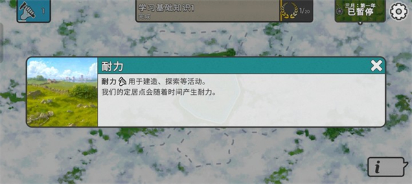 2、进入新手教程,左上角蓝色图标为【耐力】,可以用于建造、探索等活动。我们的定居点会随着时间产生耐力。