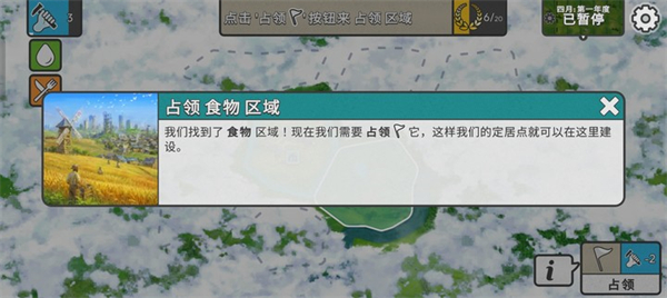 6、点击右下角的【占领】按钮,占领我们探索找到的食物区域,这样我们的定居点就可以在这里建设了。