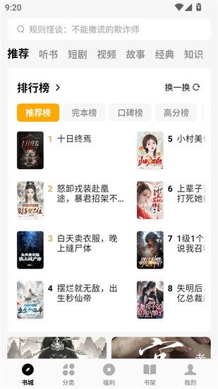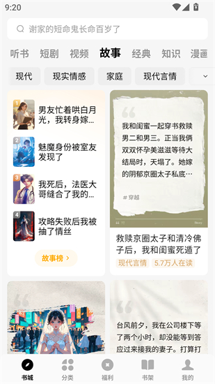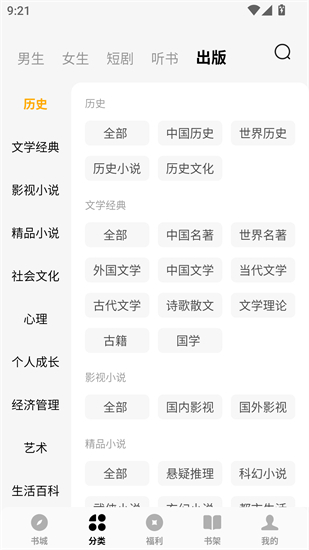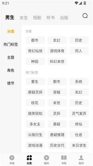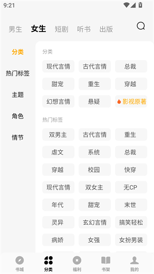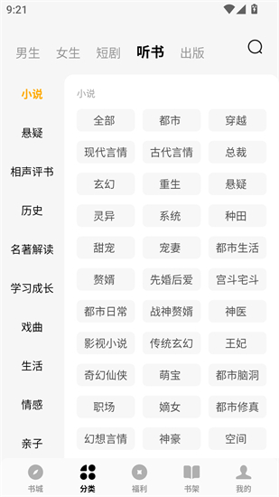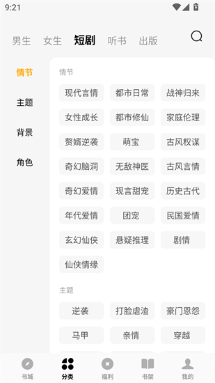 在这款软件中,小说总共分为五大类:男生、女生、短剧、听书、初版。