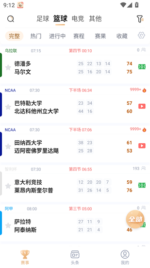 2、在首页,我们可以直接点击感兴趣的球类赛事,还能对热门、进行中、赛程、赛果等分类进行筛选。