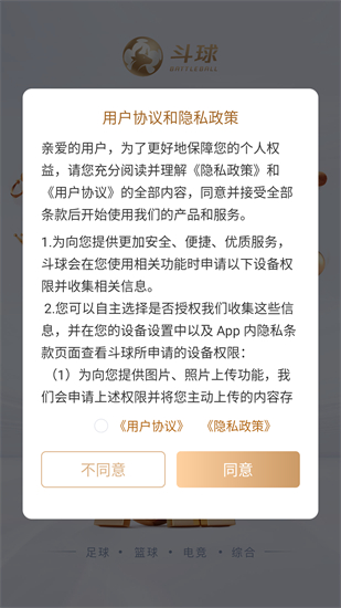 该软件直接和赛事现场相连,让用户能第一时间获取比赛的最新动态,让你仿佛置身于比赛现场,能更快地了解到每一个赛事变化,再加上专业的解说,让你能沉浸式的观赛,极大地提升你的观赛体验。总之,这款斗球体育app已经成为了许多体育迷的首选观赛软件,感兴趣的朋友可以自行在本站下载体验。1、在软件学堂下载安装斗球体育app,进入软件后,首先阅读同意用户协议。