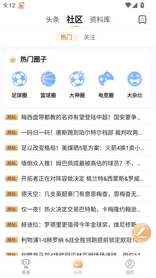 3、在【社区】中,您可以自由逛热门圈子,包含:足球圈、篮球圈、大神圈、电竞圈、大杂烩等。