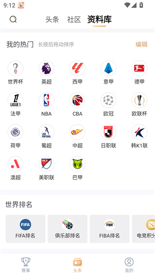 4、在【资料库】,您可以编辑自己感兴趣的内容,并查看各类体育相关信息的世界排名。