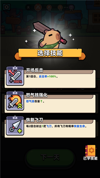 冒险者日记安卓版是一款非常受欢迎的文字冒险类手游,玩家将会扮演一只豚鼠并开始自己的冒险,游戏会通过文字的方式描述发生的事情,这些事情可以分为普通,运气不佳,小吉,大吉等多种类型,这些代表着事情的好坏,并且,在玩家前进的时候会随机遇到不同的NPC,你可以在这里获得各种各样的能力,当然了,这是会消耗生命值或是攻击力的,如果觉得技能不行,你也可以直接离开。