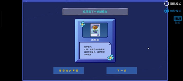6、第一关最后一波攻击完毕,我们获得了水瓶葵,不是向日葵哦。