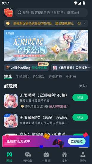 二、端游1、新用户注册后,一次性获得2小时免费游玩时长。