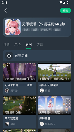 4、点击【房间】,我们可以看到许多玩家们创建的游戏房间,大家可以选择感兴趣的加入进入,也能自己创建房间,邀请好友一起来开放世界里冒险。