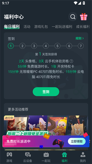 5、在【福利中心】,有每日福利、活动、游戏礼包、成长福利、一起玩送福利等,可以免费领取大量的游戏时长,喜欢的朋友不要错过了,快来本站下载畅玩游戏吧!