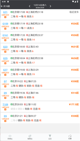在节假日的时候很多人都会选择外出旅游,大部分人会选择乘坐列车来作为交通工具,因此,小编为大家带来了盛名时刻表app,这是一款可以查询全国各地列车信息的软件,使用起来非常的简单,用户只需要输入起点与终点就可以查询到所有相关的列车信息了,如列车编号,到站时间,价格等,用户还可以在这里购买火车票,到时只需要通过软件就可以顺利达成列车了。并且为了方便用户购票,这里还加入了余票功能,你可以在这里查看每一辆列车中的剩余作为,随后根据自己的要求来进行购买座位。