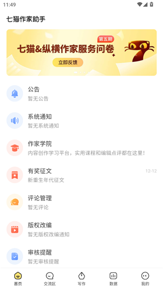 七猫作家助手旧版app是一款专门为文学创作者打造的写作交流平台,用户可以在这里创作自己的作品并进行上传审核,当你的作品通过审核之后就可以七猫或奇妙中看到了,随后软件就会自动记录作品的相关数据,如作品平均留存率,累计收藏率,万字留存,章节留存率等,让你可以直观的看到自己作品的受欢迎程度,如果你和七猫或是奇妙小说平台签约之后,还可以在这里看到作品的收入,如稿费收入,月收入概览,日收趋势,现金打赏等,这些都会为你列出详细的信息,成为你写作的动力之一。