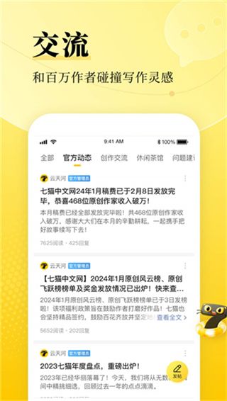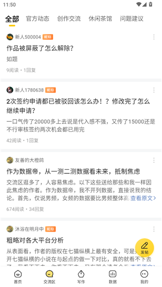 在七猫作家助手软件中,还为用户打造了一个交流区,交流区可以分为四个板块,分别是官方动态,创作交流,休闲茶馆和问题建议,用户在发布帖子的时候要选择对应的分类,这样可以更好的与其他的用户进行交流讨论。