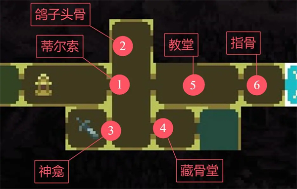3、房间最底层左边有扇门,通往神龛。在神龛可以用钱(赎罪之泪)购买孽刃升级。4、同一层的右手边,攻击墙壁可以发现隐藏的密室。密室里有珀希安的跟骨。右边的门通往亵渎之池,先不用管。中间的门通往藏骨堂,进去后可以摆放已收藏的骨头。