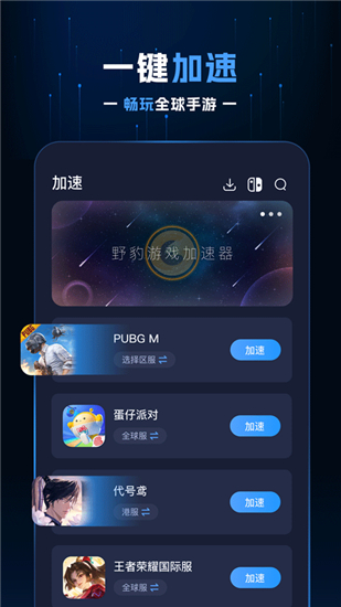 还在为游戏卡顿、掉线而烦恼吗?快来下载野豹加速器官方版app,它可轻松为您解决各种游戏网络卡顿、延迟问题,让您拥有更为流畅的游戏体验。这是专为针对手机游戏玩家所打造的一款游戏加速器软件应用,可支持全球各大热门手游加速,不论是国外还是外服游戏,都可以进行多地区节点灵活切换,用户只需轻轻一点,游戏即可飞速运行。而且软件支持游戏长时间加速状态,其加速效果稳定,根据不同用户的网络条件为您提供智能优化加速方案,减少高强度的游戏延迟。有了它,我们再也不用担心游戏网络延迟、掉线了。