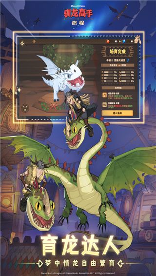驯龙高手旅程完整版是一款由同名电影改编而来的经营养成类手游,还原了电影中不同类型的龙,如巴夫贝奇,风里费,哨兵龙,雪幽灵,双头龙等,这些龙被赋予了不同的攻击方式和技能,玩家需要做的就是收集并培养合适的龙,并将不同的龙进行组合搭配,以此来击败自己的敌人。玩家在选择龙的时候尽可能的选择天赋属性高的龙,天赋属性高的龙不仅在战斗方面有着极强的战斗能力,而且在育龙方面有着非常大的优势,能够直接影响到子代龙的天赋属性,因此,选择天赋属性高的龙非常的重要。