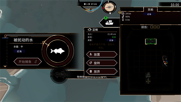 5、点击按钮进行捕鱼,捕到的鱼可以放进货舱,支持自定义摆放,能放下就行。