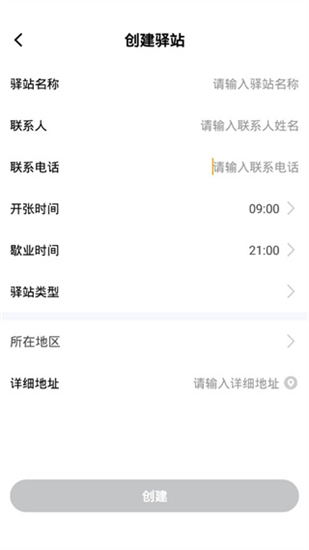 4、如果你的店主,则需要创建驿站,输入驿站名称、联系人、电话、开张/歇业时间、驿站类型和所在地区等信息。