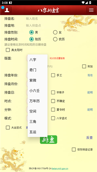 八字排盘宝最新版是一款功能丰富的八字排盘工具,为用户提供了多种排盘方式,如八字,奇门,紫微,小六壬,万年历,三角,五运等,不同的排盘方式需要填写的信息不同,测算出来的结果也不同,用户在测算的时候需要填写姓名,排盘地,排盘世界等,时间需要精确到分钟,在时间上还可以设置早晚子,不确定,夏令时等,之后就可以直接进行排盘了,软件会根据填写的信息给出对应的测算结果,你可以在这里了解自己近期的运势,命格,神煞等信息。