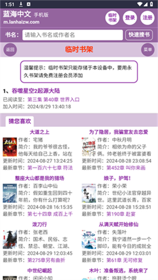 2、在临时书架中可以找寻点击阅读过创小说,可以查看加入时间和上一次阅读的章节。