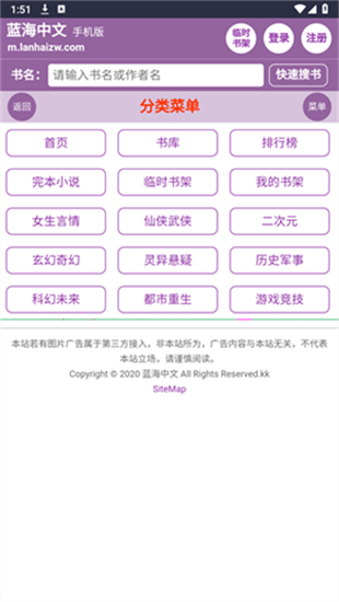 1、打开从本站下载的蓝海搜书-自由的小说搜索软件,在分类菜单中可以查找自己感兴趣的小说题材。