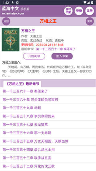 3、在软件中找到你感兴趣的小说,可以查看它的简介和最新的章节,可以直接点击感兴趣的章节开始读小说。