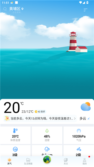 最美天气预报官方版是一款功能丰富的天气预报软件,拥有准确的天气预报,还会实时显示体感温度,湿度,气压,紫外线,风力风向等信息,而且还加入了小时天气,用户可以在这里看到每一个时间段的天气,温度等,让你可以更好的进行出行安排。并且,软件中还加入了天气生活版块,这里会根据天气情况来为用户推荐日常出现,户外休闲,运动健康等信息,让用户拥有合适的参考目标,同时,软件还为用户准备了资讯版块,你可以在这里了解最新的新闻资讯,健康,视频,科技娱乐,财经,美食等各方面资讯这里都有。