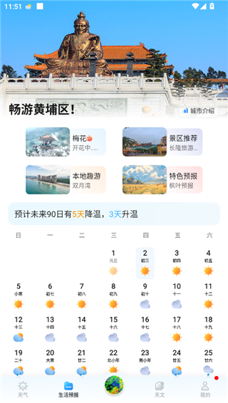 在最美天气app中,用户还可以在这里查看其他地区的天气或是进去的情况,这里还有专门的城市介绍,景区推荐等,而且还加入了当地的特色预报,如星空预报,中暑预报,枫叶预报,樱花预报等,感兴趣的小伙伴快来下载体验吧。