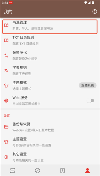 2、在我的页面中找到并点击书源管理,用户可以在这里新建,导入,编辑或管理书源