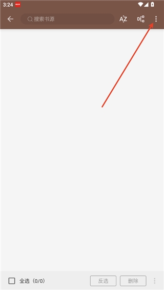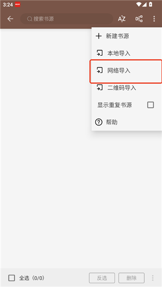 3、来到阅读app书源页面,这里空空如也,点击右上角的更多选项,在弹窗中选择网络导入,用户也可以选择其他的选项