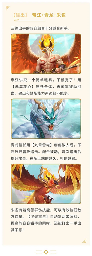 帝江讲究一个简单粗暴,干就完了!用【赤翼攻心】席卷全体,再依靠被动回血。输出和站场能力两边都不能少。