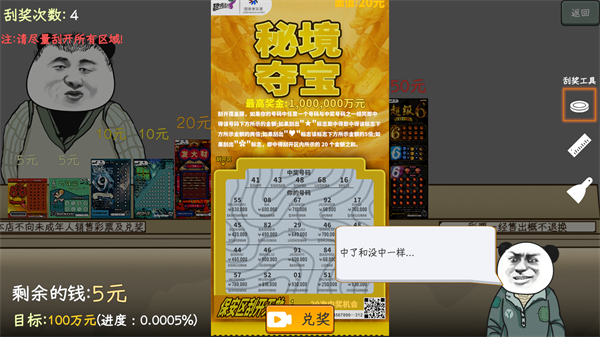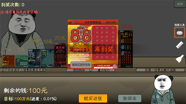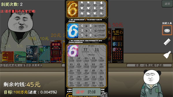 中国式彩票老王的逆袭游戏是一款根据中国式网游游戏改编的模拟手游,它将彩票购买和刮奖的元素融入到游戏中,为玩家带来了一个独特的游戏体验。在游戏中,玩家可以购买多种不同面值的彩票,中奖概率随机。游戏的玩法简单直观,玩家需要先支付相应的金额购买彩票,然后通过刮奖来揭晓中奖情况。