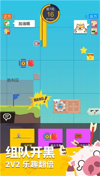 派对制造官方正版是一款非常有趣的沙盒动作手游,融合了多种玩法元素,对抗,合作,冒险,闯关等,大大丰富了游戏的可玩性,游戏采用的是Q版的卡通风格设计,进入游戏之后还可以选择独特的卡通角色,你需要控制角色进行冒险闯关,不断的前进并获得奖励。游戏为玩家带来了两种模式,一个是单人闯关玩法,另一个是多人合作玩法,多人模式中,玩家将会与随机匹配到的队友一起合作,并通过默契的配合通过关卡,当然了,你也可以直接邀请自己的好友进行游戏。