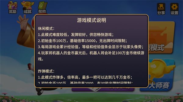 1、此模式难度较低,发牌较好,供您畅快游戏。2、初始金币100万,基础倍率15000,无出牌时间限制。