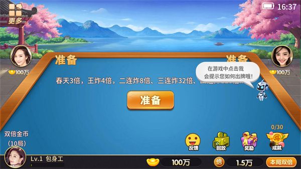 3、每局游戏会累计经验值,等级和经验值条会显示于玩家头像旁。4、玩家将机器人的金币赢光后,机器人将会补足100万金币继续游戏。