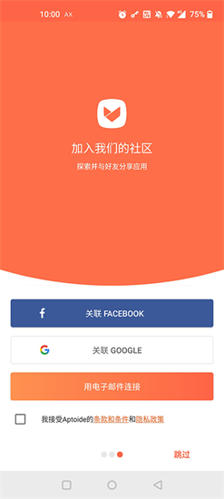 4、社区驱动的生态系统。1、打开从本站下载的Aptoide应用商店,可以关联您的FACEBOOK或GOOGLE账号与电子邮件,也可以跳过登录步骤。
