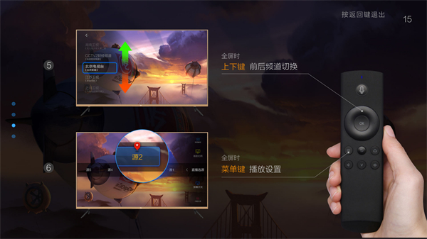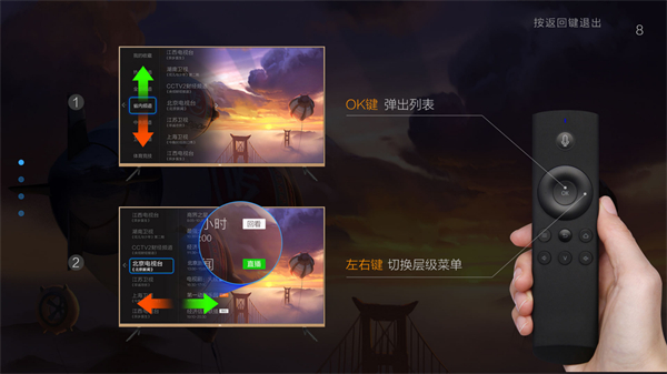 2、然后进行新手教程,了解遥控器的具体操作功能,OK键弹出列表,左右键切换层级菜单。