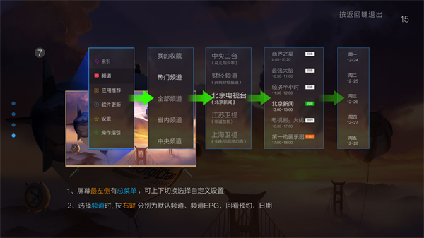 5、屏幕最左侧有总菜单,可上下切换选择自定义设置。选择频道时,按右键分别为默认频道、频道EPG、回看预约、日期。