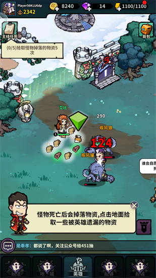 5、玩家还可以派遣英雄去森林里战斗,怪物死亡后会掉落物资,点击即可拾取。