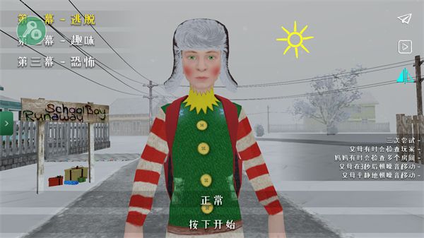 游戏拥有多种结局,玩家可以通过选择不同的路线来进行攻略,每次选择都可能导致截然不同的结局。例如,玩家可以尝试将门铃按到20次,这将触发一系列连锁反应,导致妈妈发疯并离开家门,此时你可以趁机悄悄逃出。除此之外,在schoolboy runaway你还可以选择从阁楼、电线杆、后室等隐蔽的地方逃跑,感兴趣的小伙伴快来下载试试吧!逃离家暴游戏以圣诞节为背景,加入了丰富的圣诞元素,如圣诞树、礼物、雪花等,营造出浓厚的节日氛围。
