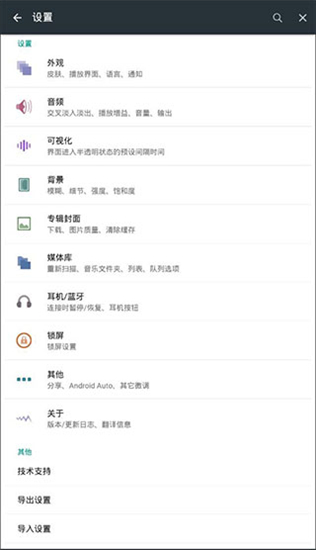 5、在设置功能中,可以对外观、音频、可视化、背景、专辑封面、媒体库、耳机/蓝牙、锁屏等内容进行自定义设置。