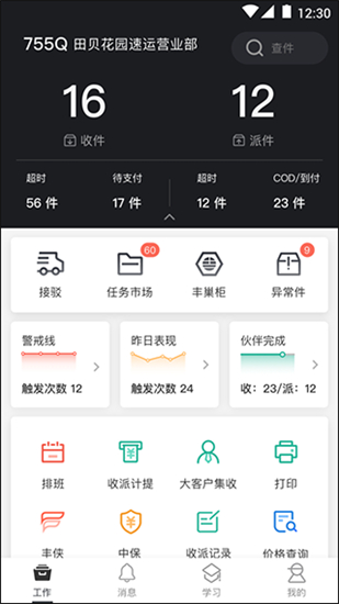 4、提供详细的数据统计和分析功能,快递员可以随时查看工作量、派件收入等数据,帮助更好管理工作。2、学习:在线学习专业技能并提升个人能力。