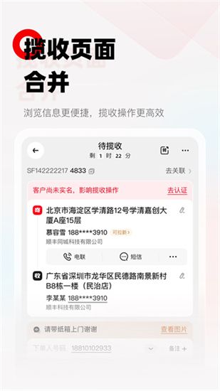 此外,揽收页面的合并功能将揽件和收件信息整合在一起,方便快递员在同一个界面中完成所有相关操作,避免了来回切换页面的繁琐,进一步提升了工作效率。顺丰小哥app官方最新版本还集成了多种实用功能,为快递员提供了全方位的工作支持,有需要的朋友欢迎前来下载!1、派件通知列表总部数据支持,提供多种签收人供选,支持批量签收、处理问题件,减少工作步骤,大幅提升签收效率。
