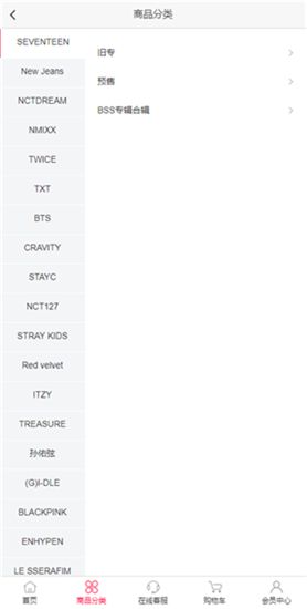 4、在商品分类页面,会将idol的周边根据团体进行更加细致的分类,方便用户从中挑选心仪的商品。