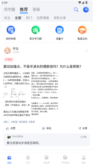 笔袋app是一款综合性服务平台,这里为用户带来了众多的功能,如社区,学习规划,工作规划,志愿填报等多种功能,适用于不同的人群,来到社区版块,这里有着各种各样的帖子,如问答帖,日常帖等,还有着专门的答疑版块,用户如果在学习上遇到了什么难题,可以在这里发布,这里的帖子被分成了多个部分,全部,待解决,悬赏和已解决,用户可以根据自己的想法选择对应的版块。而在学习版块中,用户可以选择自己的地区和年级,随后软件会自动选出学习资料和大量的真题,让用户可以在这里进行学习。
