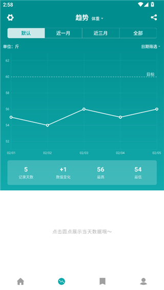 为了让用户可以更加直观的了解到自己体重的变化,体重日记app还加入了趋势版块,会根据用户每日的体重变化来绘制图形,并会根据记录天数,数值变化,最高体重和最低体重进行标注,而且设置了不同的时间段,近一月,近三月等,让你全面了解相关信息。