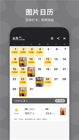 体重日记app是一款非常简洁的健康管理软件,这里并没有什么花里胡哨的功能,有的只是实用,简单的体重记录和管理功能,能够帮助用户了解自己的体重变化,而使用的方式也很简单,只需要将自己每天的体重数据进行记录即可,记录之后软件会根据用户填写的数据计算出身体的脂肪含量和BMI,BMI指数的正常范围是18.5-23.9,低于18.5需要合理饮食,增加体重,而高于23.9则需要控制饮食,减少体重,同时,用户可以在这里设置目标体重,并制定对应的减肥/增重计划,将体重维持在目标范围。