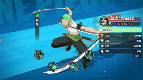 3技能【世界第一大剑豪】:索隆如果是最先出手的则会增加自身的伤害和暴击率,如果不是则会在每次攻击时都有概率额外多攻击1个敌方角色;