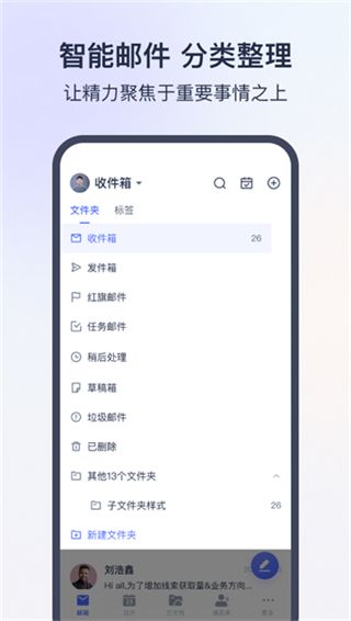 该软件中还加入了通讯录,企业网盘,个人网盘,通讯录等功能,而且可以实时接收邮件,收到新邮件之后会立即提醒用户,确保不会错过重要邮件。与其他的邮箱软件不同,网易灵犀办公软件的邮箱并没有容量限制,你不用时不时的删除旧邮件来保留邮件容量,有需要的朋友可以来下载试试。