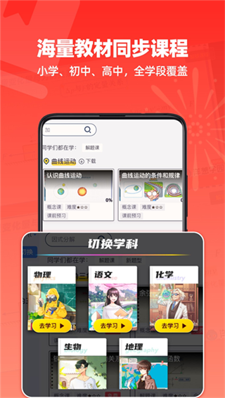 洋葱学园官方版是一款非常专业的线上学习软件,这里可以为学生提供众多的教学资源,软件支持小学,初中,高中等不同年级的学生进行学习,涵盖了所有的学科,如语文,数学,英语,物理,化学,生物等,用户可以在这里根据自己的需求选择性学习,而且这里还有着大量的视频和直播课程可以观看,还有着各种各样的动画视频和老师讲课,帮助用户轻松学习知识。并且,软件还支持教材同步,可以根据用户手中的教材来更新推荐的内容,确保用户可以学到相应的知识。