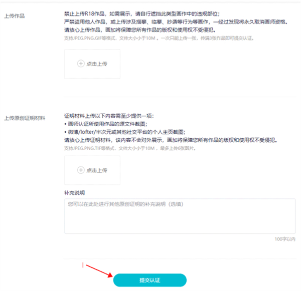 3、最后,在认证页面填写您的个人信息以及作品,提交认证后等待官网认证信息的回复即可。