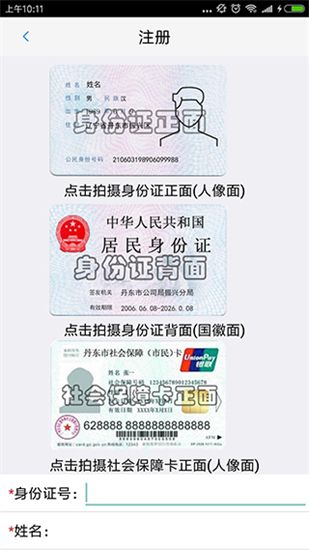 3、也可以在丹东惠民卡app官方版里直接点击拍摄身份证,注意将身份证人像面与模板框对齐。
